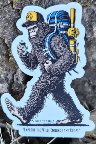 Celebrate your adventurous spirit with the Explore the Wild Bigfoot Sticker. Featuring Bigfoot carrying a hiking backpack and a cold beer, this sti...
