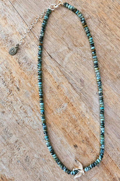This piece is subtle but full of meaning. The Lulu African Turquoise Bird Necklace features a choker-style strand of african turquoise beads with a...