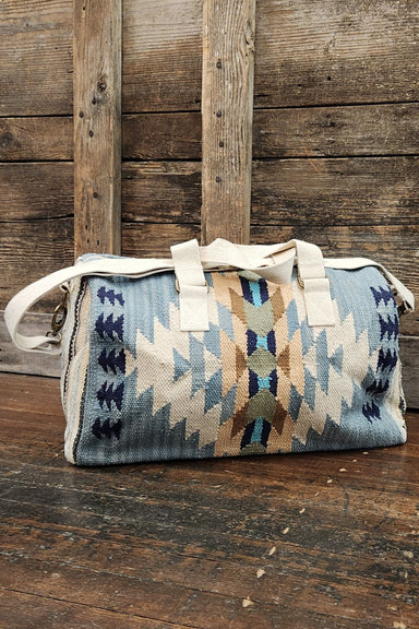 The Blue, Cream & Tan Western Duffel Bag features a bold Southwestern-inspired pattern in blue, cream, and tan tones, giving it that standout, ...