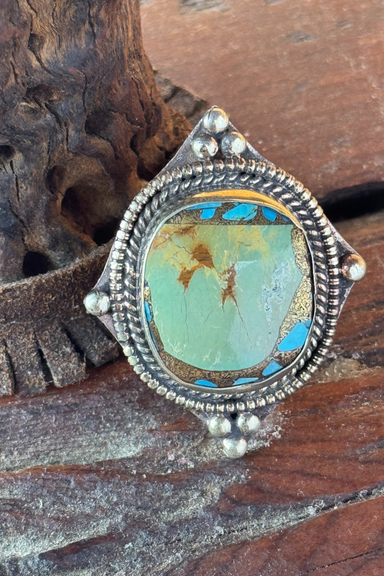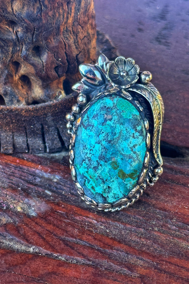 This one-of-a-kind Tibetan silver chrysocolla statement ring is handcrafted in Nepal using traditional Himalayan design techniques. Each ring featu...
