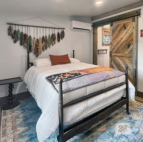 In this home, the cowhide rugs ground the rooms visually while adding warmth and texture without overpowering the space. They’re practical, timeless, and unfussy — perfect for an Airbnb where comfort and durability matter just as much as style.