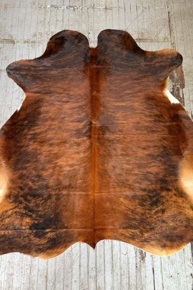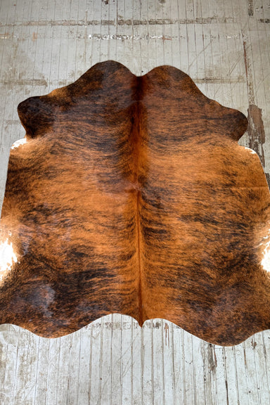 Brown brindle cowhide rug tanned in Brazil. It measures approx. 6'5 x 5'4 and ships for only $3. We love to see these hides underfoot in a living r...