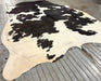 Black and white spotted cowhide rug, tanned in Colombia. It measures 7'4 x 5'10. The hide you see is the hide you get, and ships for only $3.