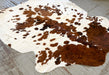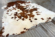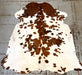Brown & White Spotted cowhide rug, tanned in Colombia. It measures 7' x 5'5. The hide you see is the hide you get, and ships for only $3.