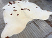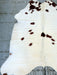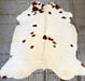 White & Red spotted cowhide rug, tanned in Colombia. It measures 6'6 x 5'8. The hide you see is the hide you get and ships for only $3.