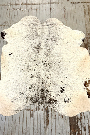 White & Black Speckled cowhide rug, tanned in Brazil. It measures 6'4 x 5'5. The hide you see is the hide you get, and ships for only $3. We l...