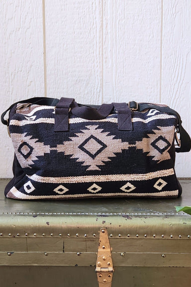Carry your essentials in style with this Black, Taupe, and Cream Aztec Duffel Bag. Crafted from durable cotton rug material, it combines rugged tex...