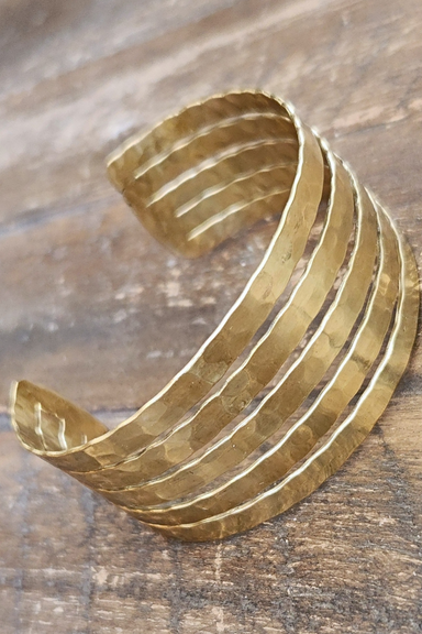 Add a dash of edgy charm to your look with the Lori Hammered Metal Ribbon Cuff Bracelet. Featuring playful striped cutouts and a textured hammered ...