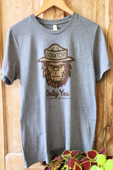 Be the ultimate believer with our "Only You Can Stop The Skeptics" T-shirt. Featuring a sasquatch with a ranger hat that reads "squatchy", this pla...