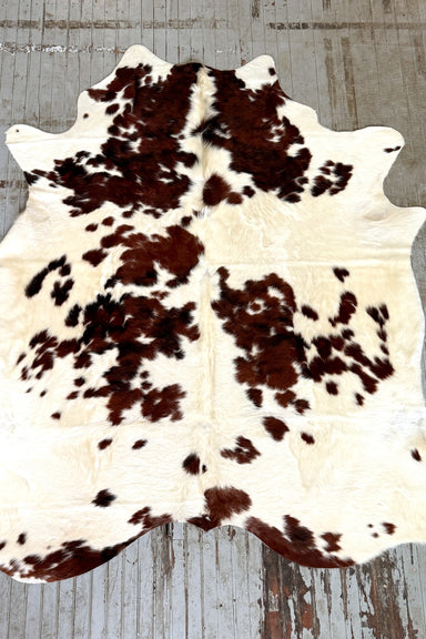 Reddish brown and white cowhide rug tanned in Brazil. It measures 6'4 x 6' and ships for only $3. We love to see these hides underfoot in a living...