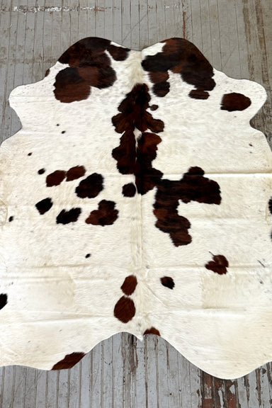 Black and white spotted cowhide rug tanned in Brazil. It measures approx. 7' x 6'9 and ships for $3. The hide you see is the hide you get. We love ...