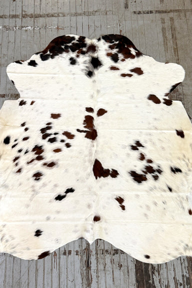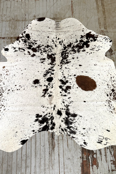 White and black speckled cowhide rug, tanned in Brazil. It measures 5'9 x 5'9. The hide you see is the hide you get and ships for only $3. We love ...