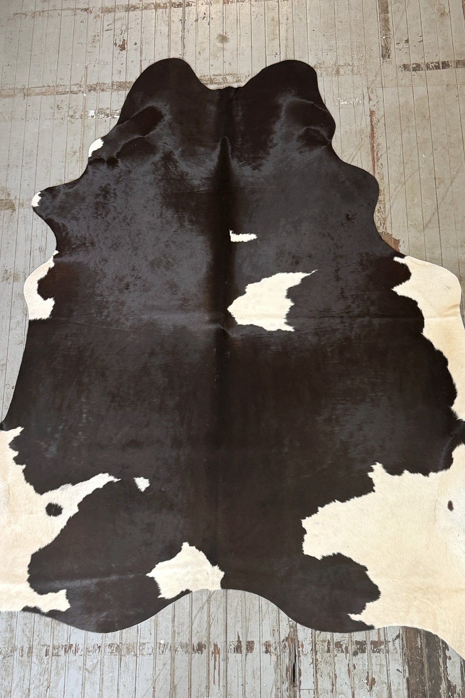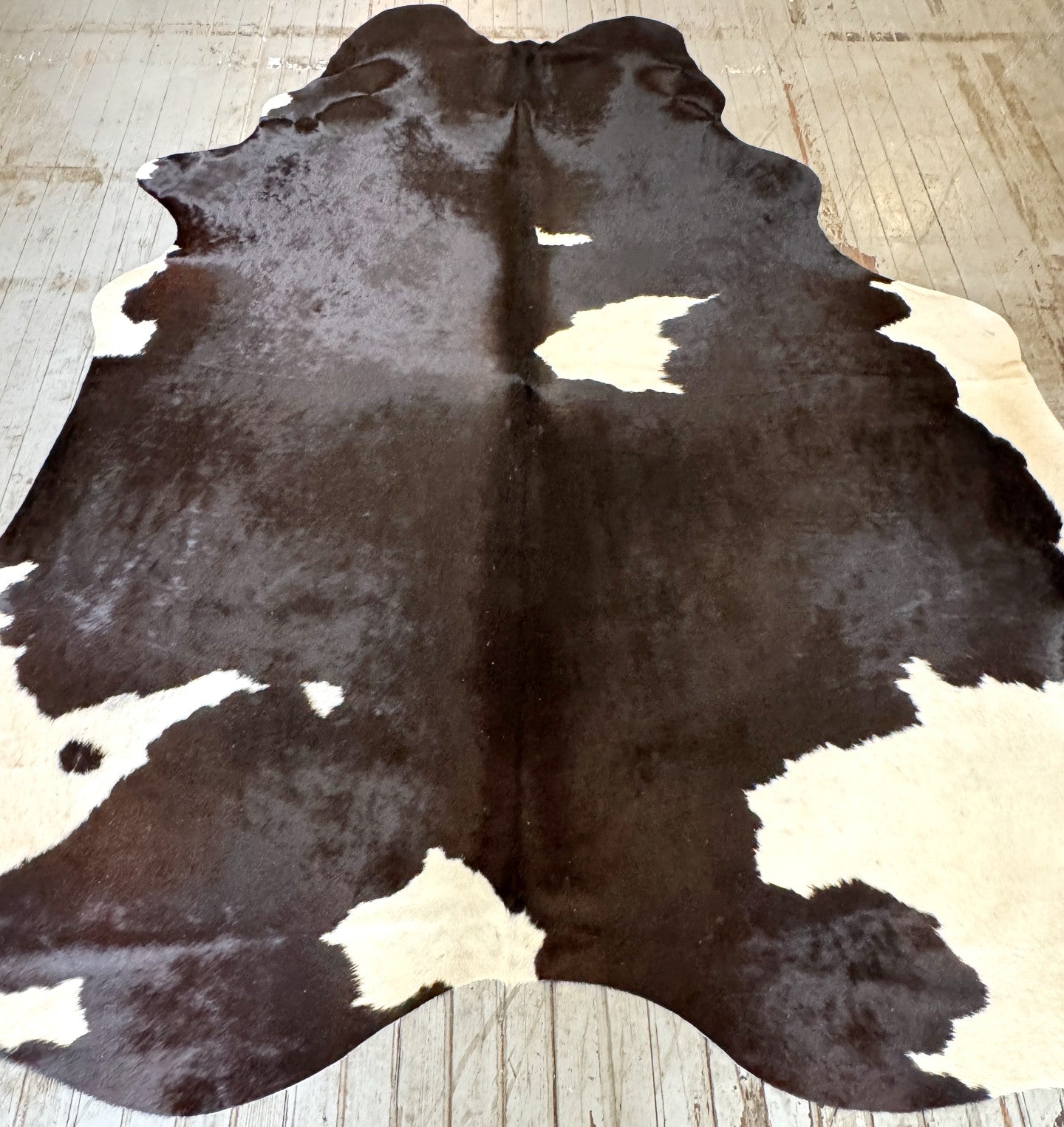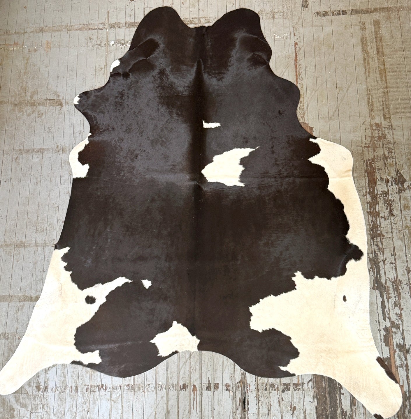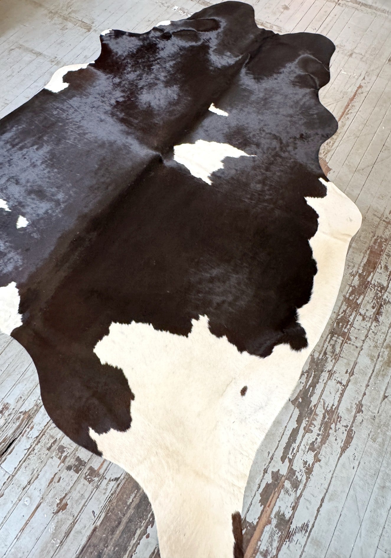 Black and white cowhide rug tanned in Brazil. The hide measures approx. 7' x 5'6 and ships for only $3.