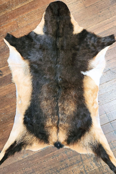 Black & Tan goat hide rug. It measures approximately 2'10 x 1'8. The hide you see is the hide you get and Ships for only $3. Cactus Creek has s...