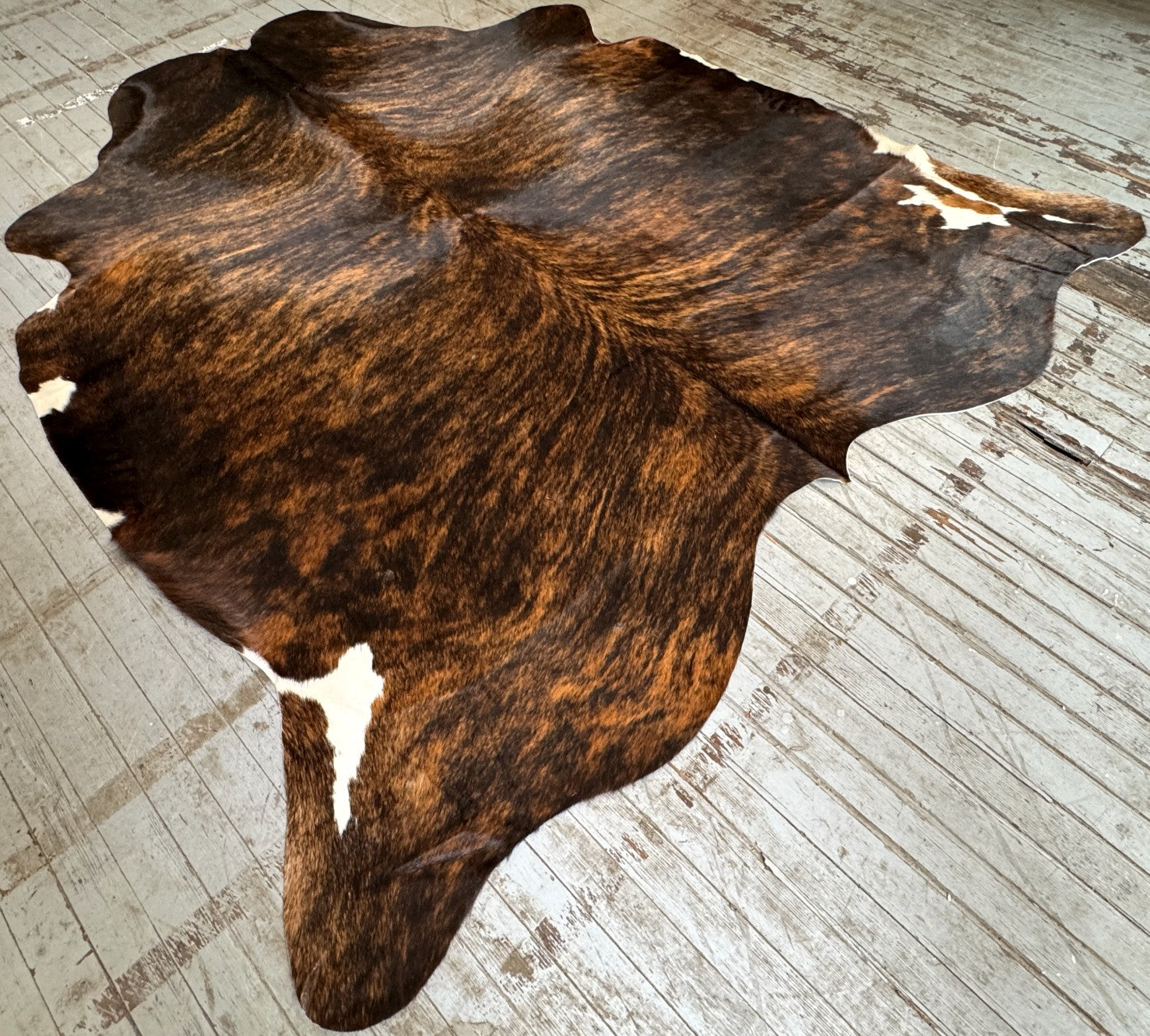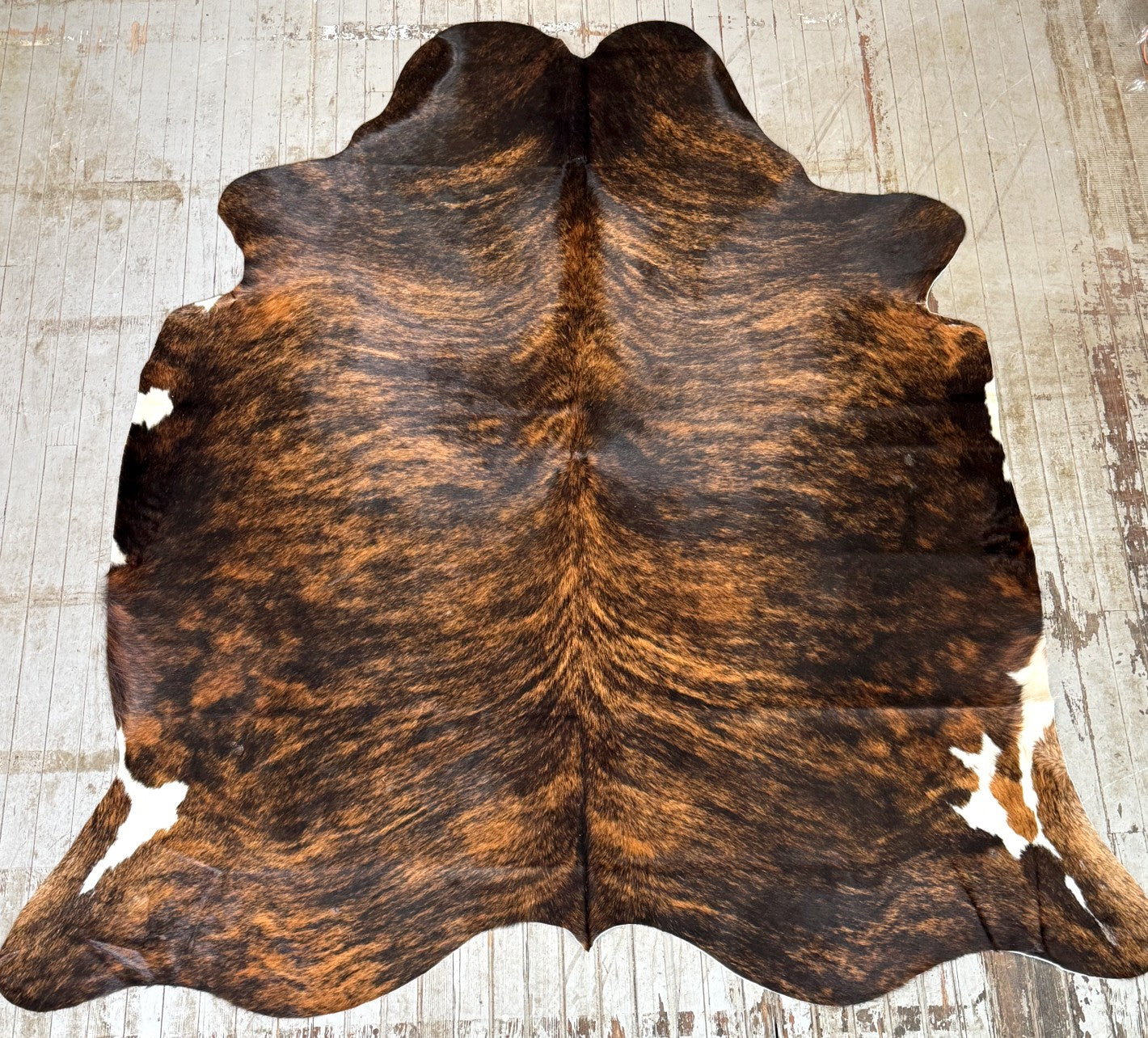 Dark Brown Brindle cowhide rug tanned in Colombia. It measures approx. 6'4 x 5'5 and ships for only $3.