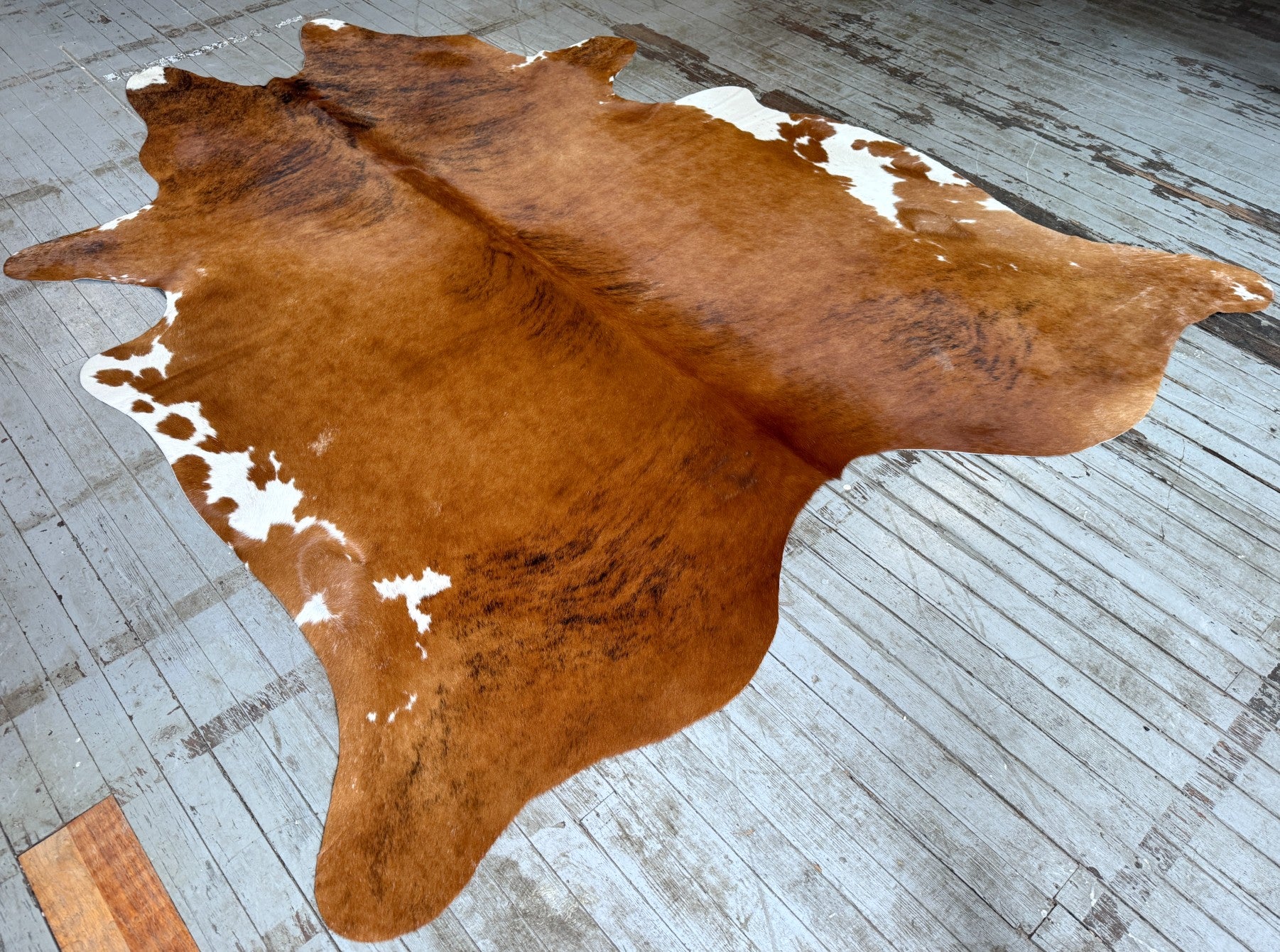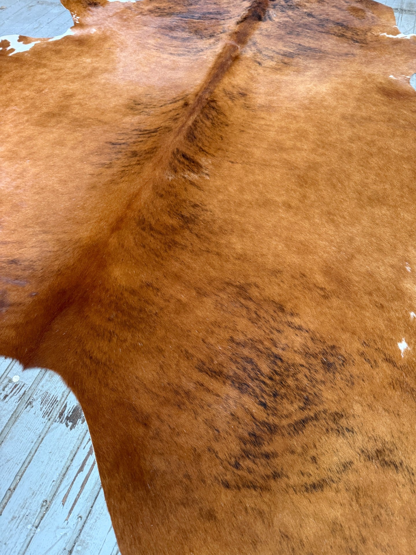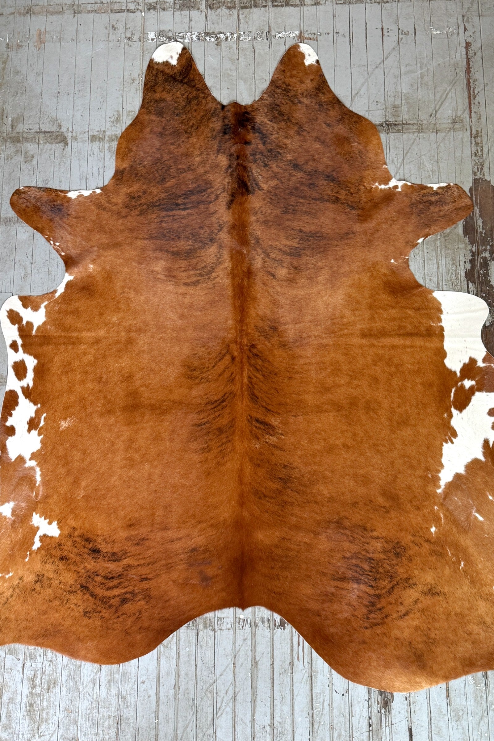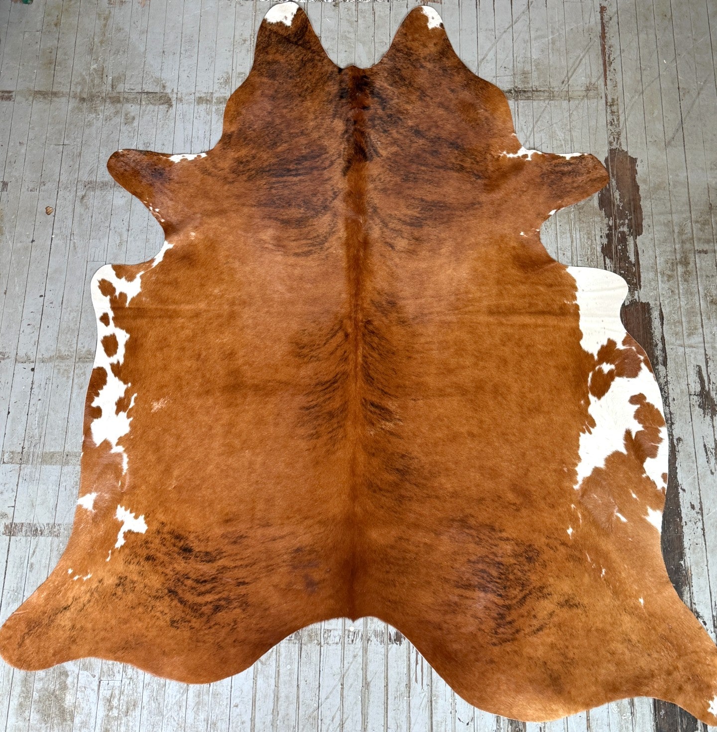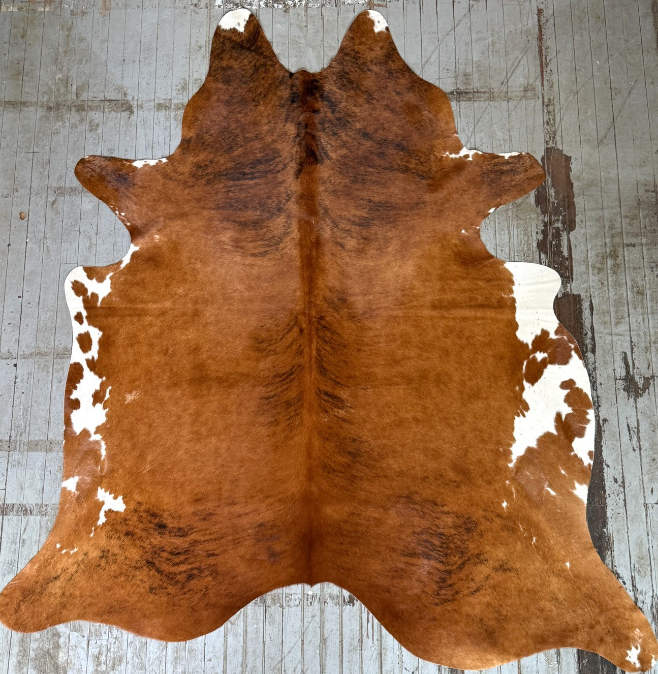 Brown brindle cowhide rug tanned in Brazil. It measures approx. 6'5 x 5'4 and ships for only $3.
