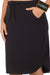This black skirt features a flattering tulip hem that adds a graceful, flowing silhouette. Crafted with stretchy fabric, it offers comfortable movement all day long. Practical side pockets blend seamlessly into the design, perfect for keeping essentials close. A stylish and versatile piece that effortlessly combines comfort with elegance.