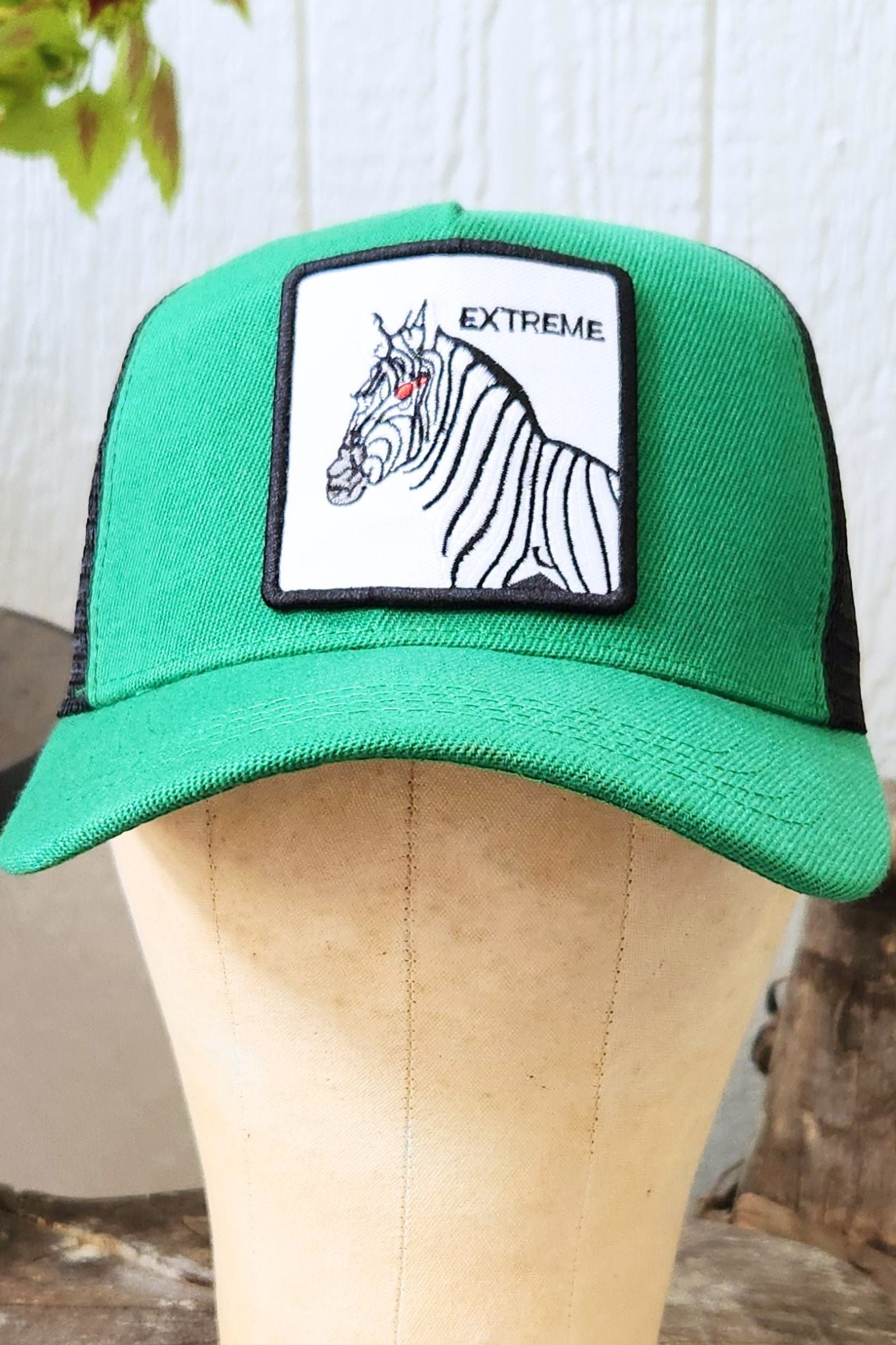 Unleash your wild side with our Extreme Zebra Trucker Hat. Featuring a fierce "extreme" zebra patch, this green and black hat is perfect for those who want to stand out from the crowd. Embrace the unconventional with this playful and stylish accessory.