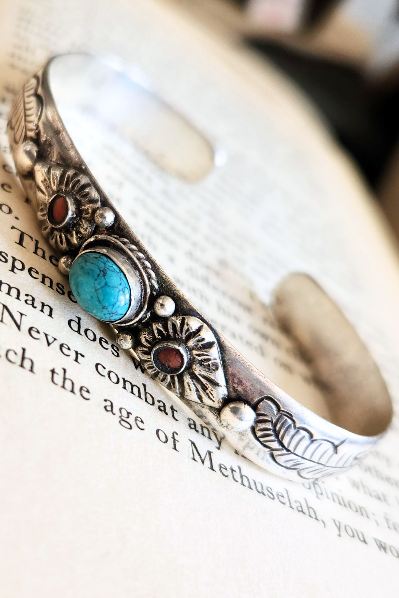 Unleash your inner fashionista with our Silver Turquoise Flower Cuff Bracelet. This cuff bracelet, intricately designed with a turquoise flower, is a unique blend of style and elegance. Crafted by skilled artisans, it reflects our commitment to promoting traditional craftsmanship and ethically sourced products. Whether you're dressing up for a special occasion or adding a touch of sophistication to your everyday look, this bracelet is the perfect accessory. It's more than just a bracelet, it's a statement of your unique style and the values you hold dear.