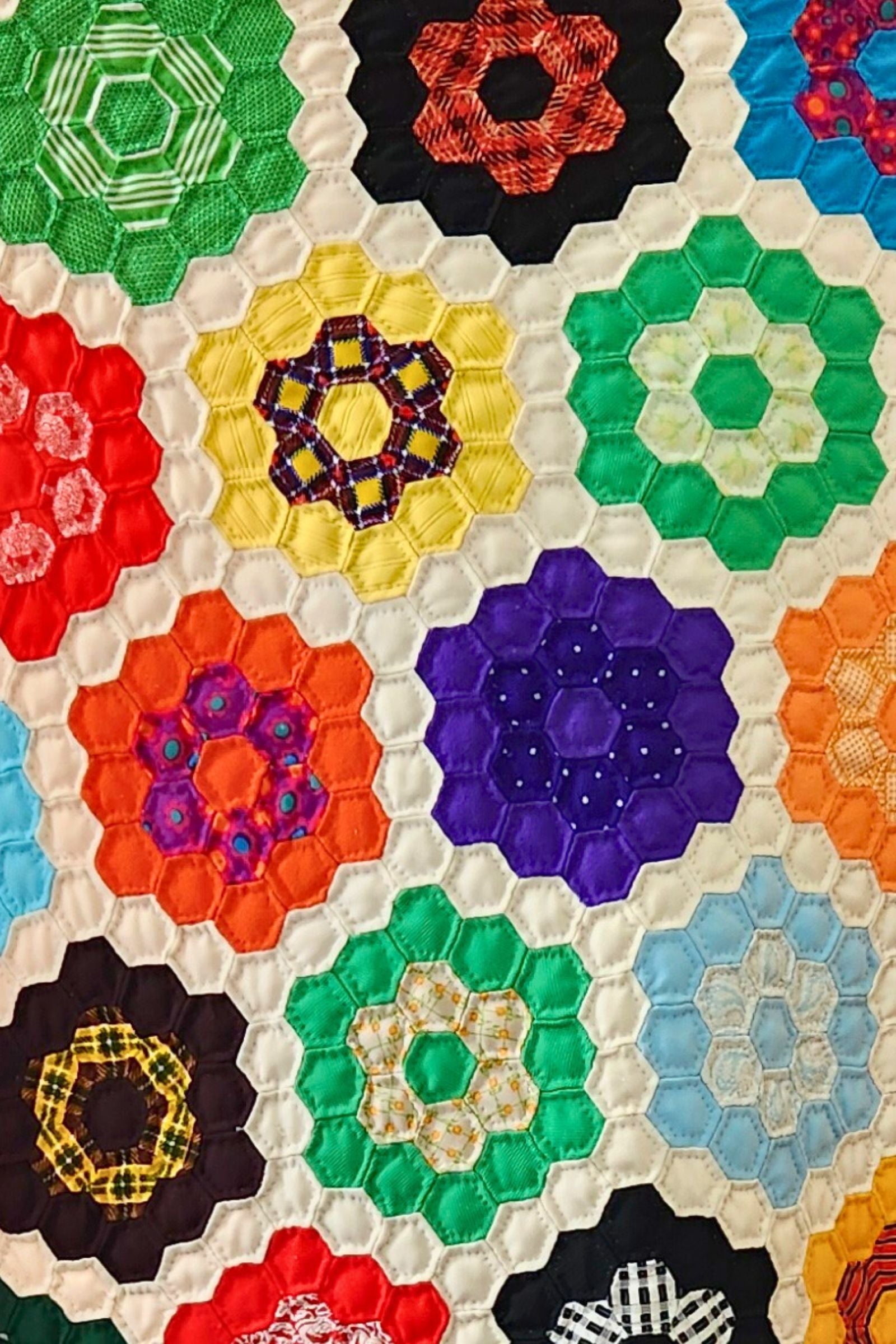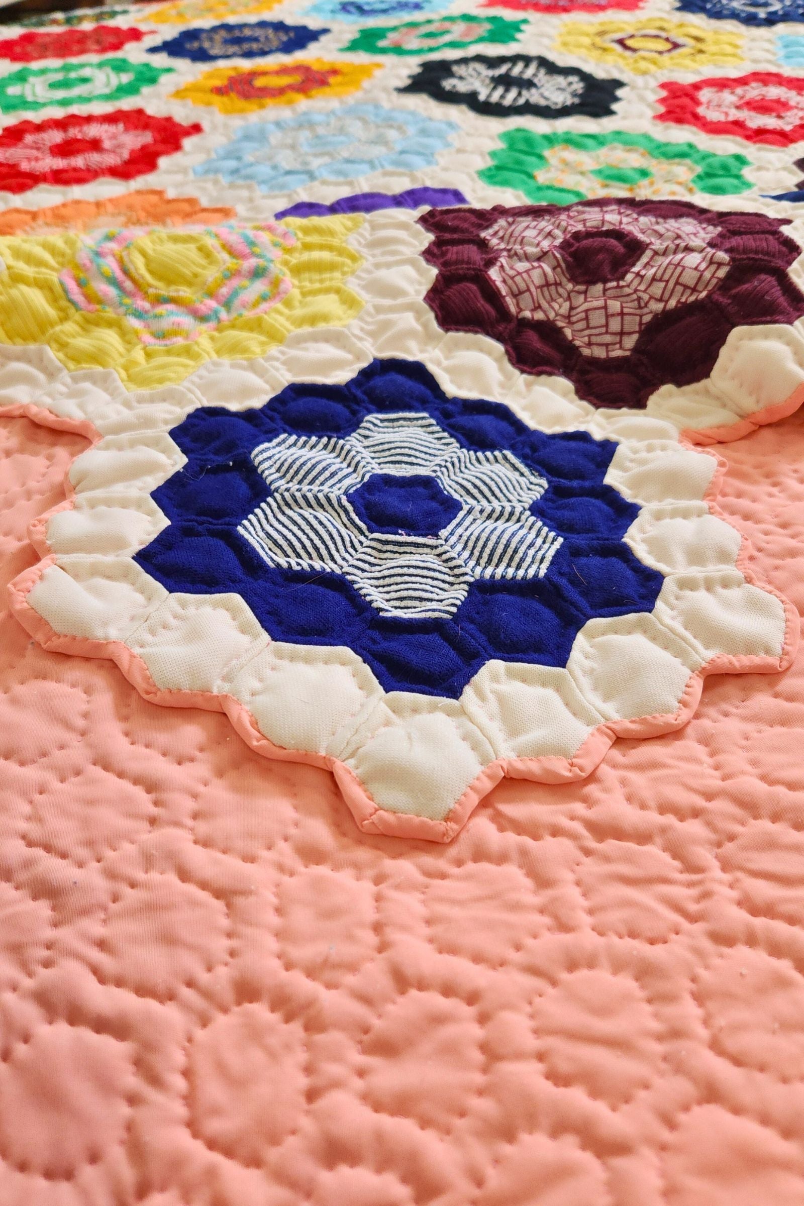 The Vintage Grandmothers Flower Quilt is a labor of love, hand sewn with precision and care. Made from vintage hexagon fabric pieces, this quilt is a beautiful addition to any home decor. Add a touch of nostalgia and comfort with this timeless quilt, reminiscent of a grandmothers flower garden.